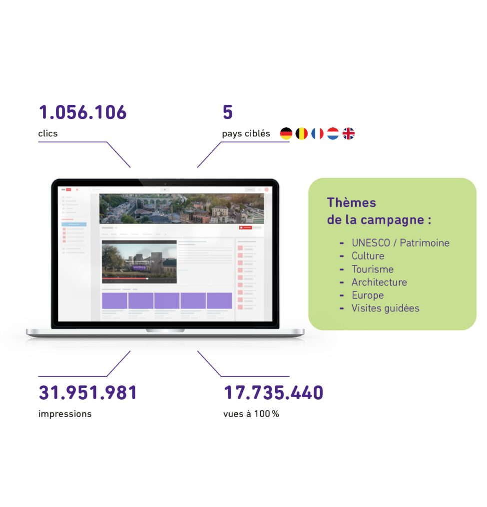 Dans le cadre de la stratégie LCTO visant à promouvoir les atouts de la ville de Luxembourg, une campagne digitale internationale d’envergure a été menée en 2024. Trois types de campagnes ont été lancées : une campagne Performance pour la vente de billets des casemates (1.438 conversions générant un chiffre d’affaires de 54.811€), une campagne de Notoriété ciblant cinq pays, et une campagne Saisonnière.